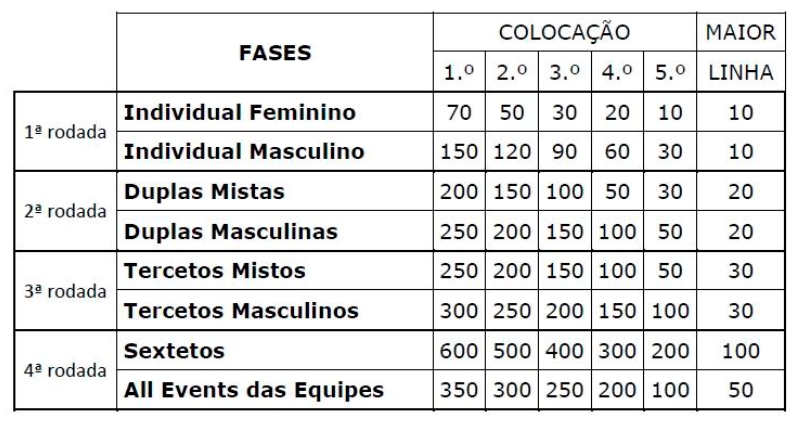 8.1 – Os eventos serão disputados no sistema de pontos ganhos e ao final, a Equipe do evento que somar maior número de pontos será consagrada campeã, conforme tabela de pontuação abaixo.