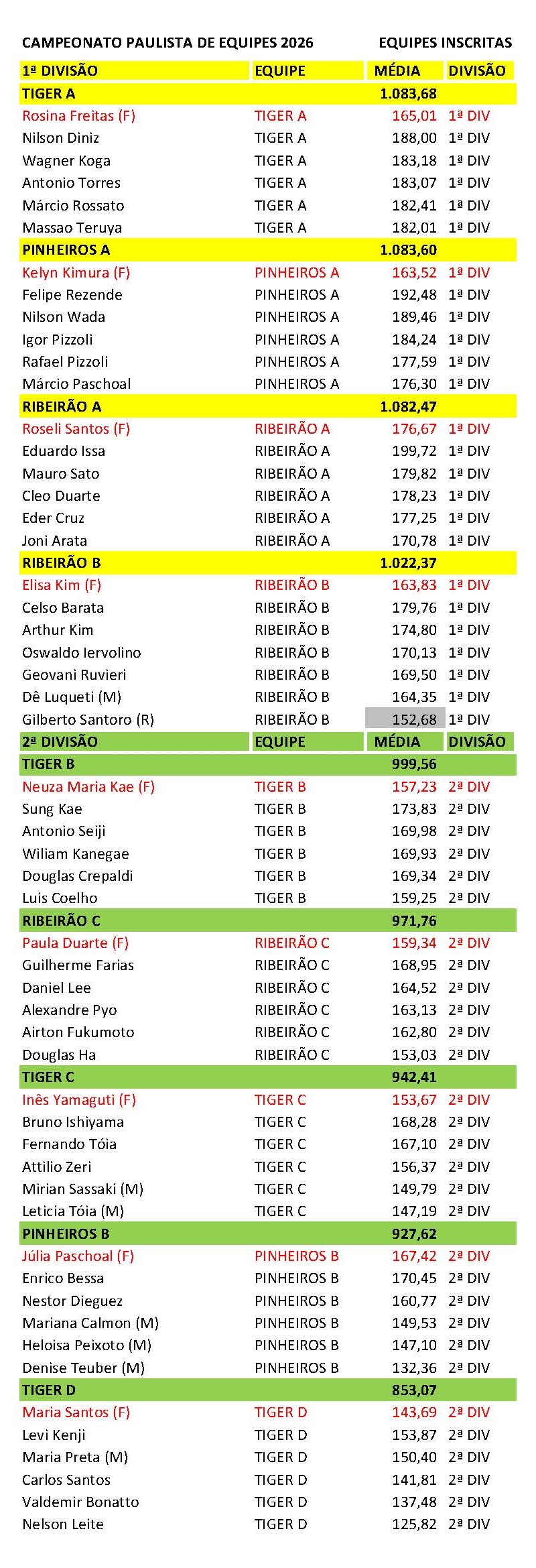 7.2.1 – As 2 (duas) divisões serão formadas conforme o total das médias das equipes, a critério dos organizadores da FPBOL com base no Ranking de Médias atualizado até a 44.ª Taça São Paulo 2026.